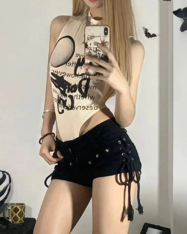 Y2K Harajuku Wide Mini Denim Shorts – Elastic Punk Print Jean Shorts for Women