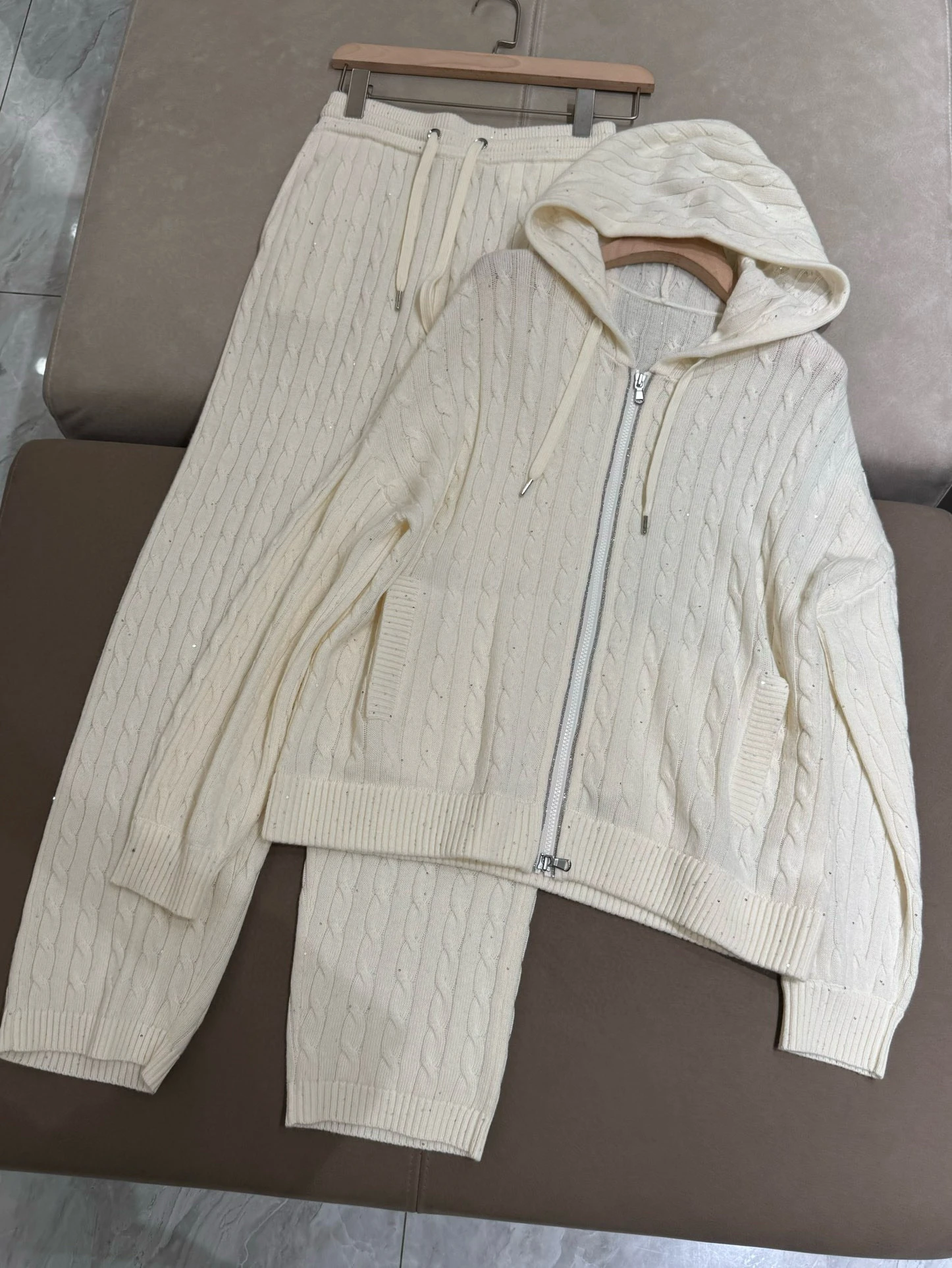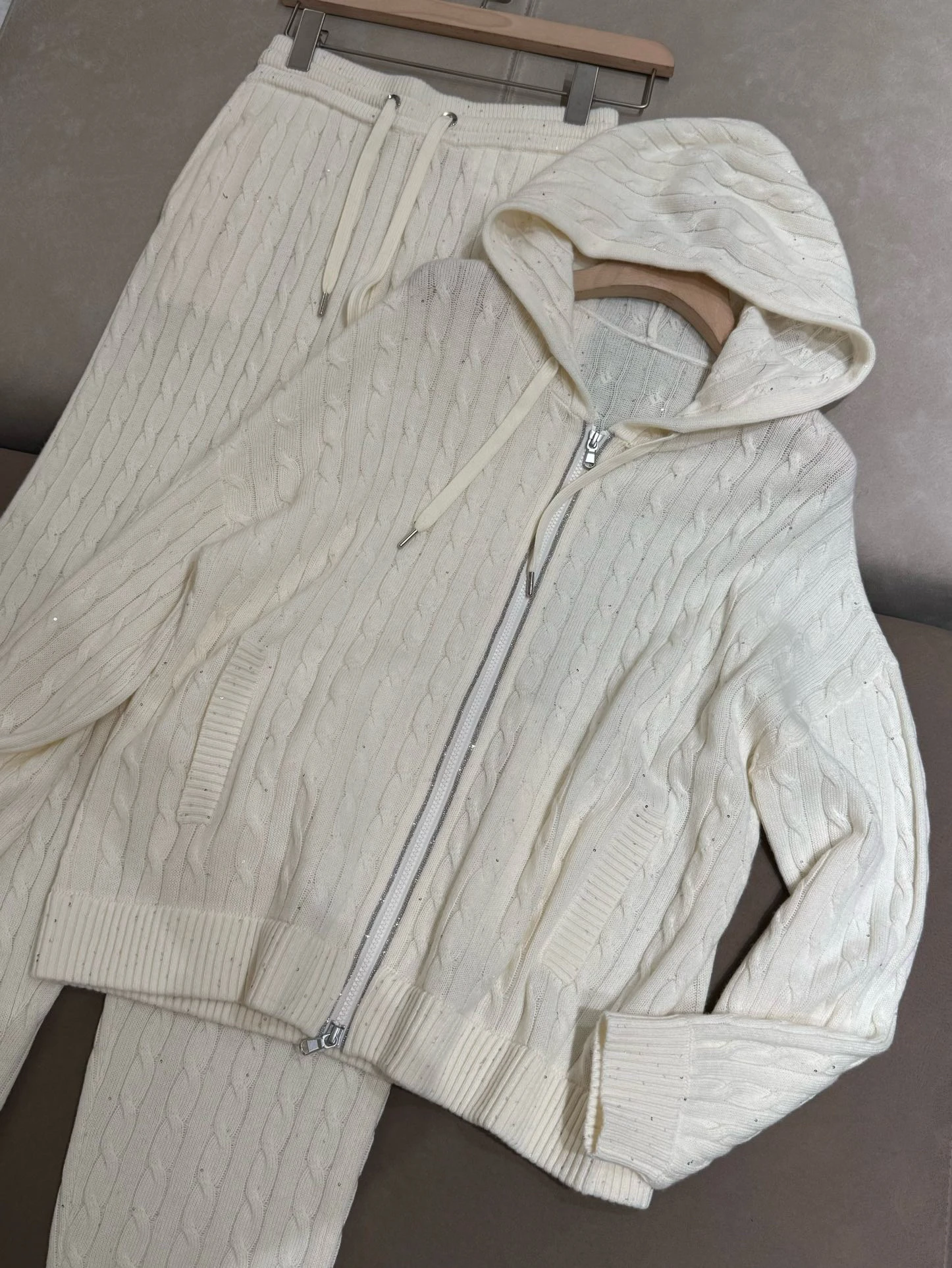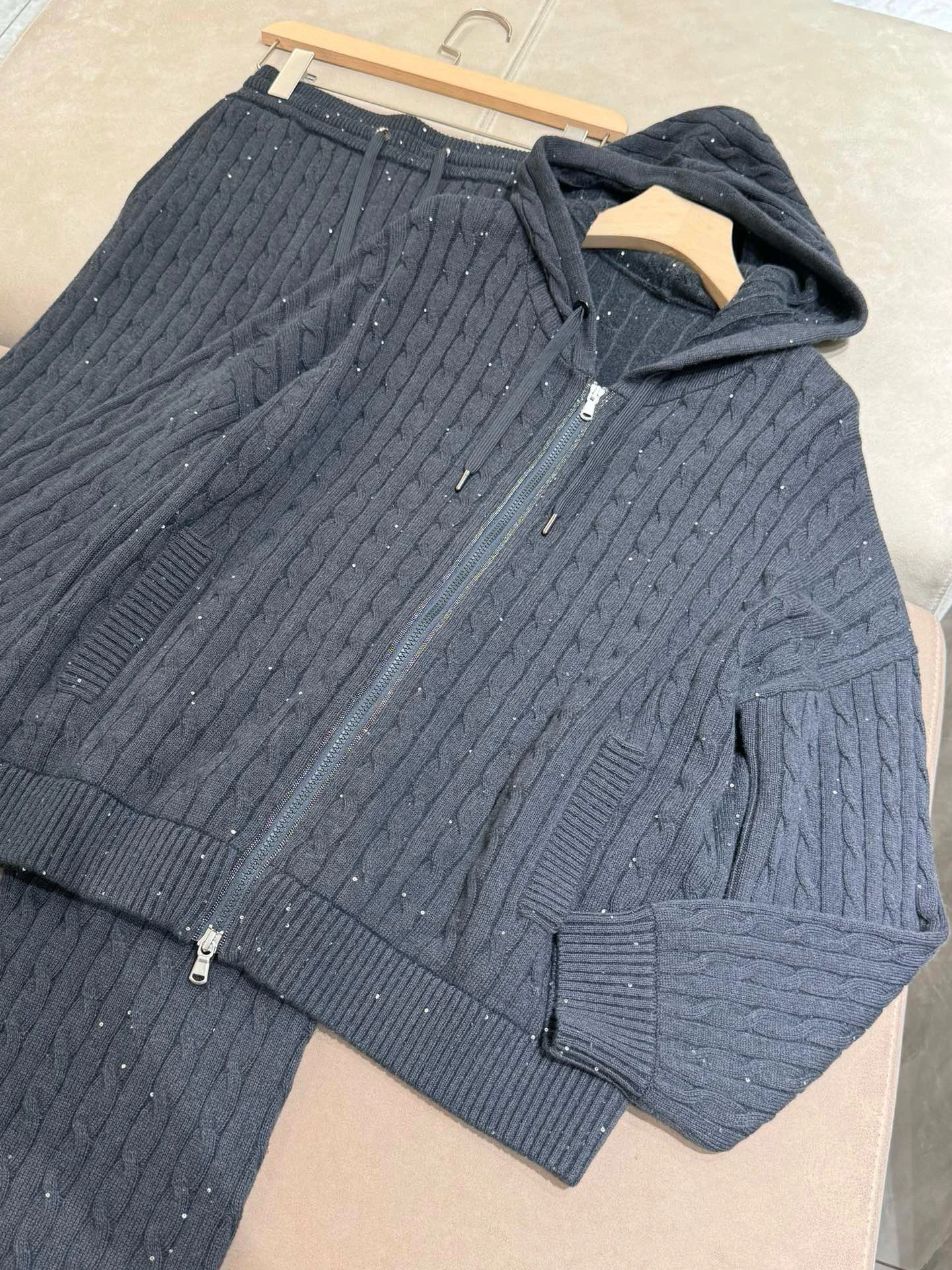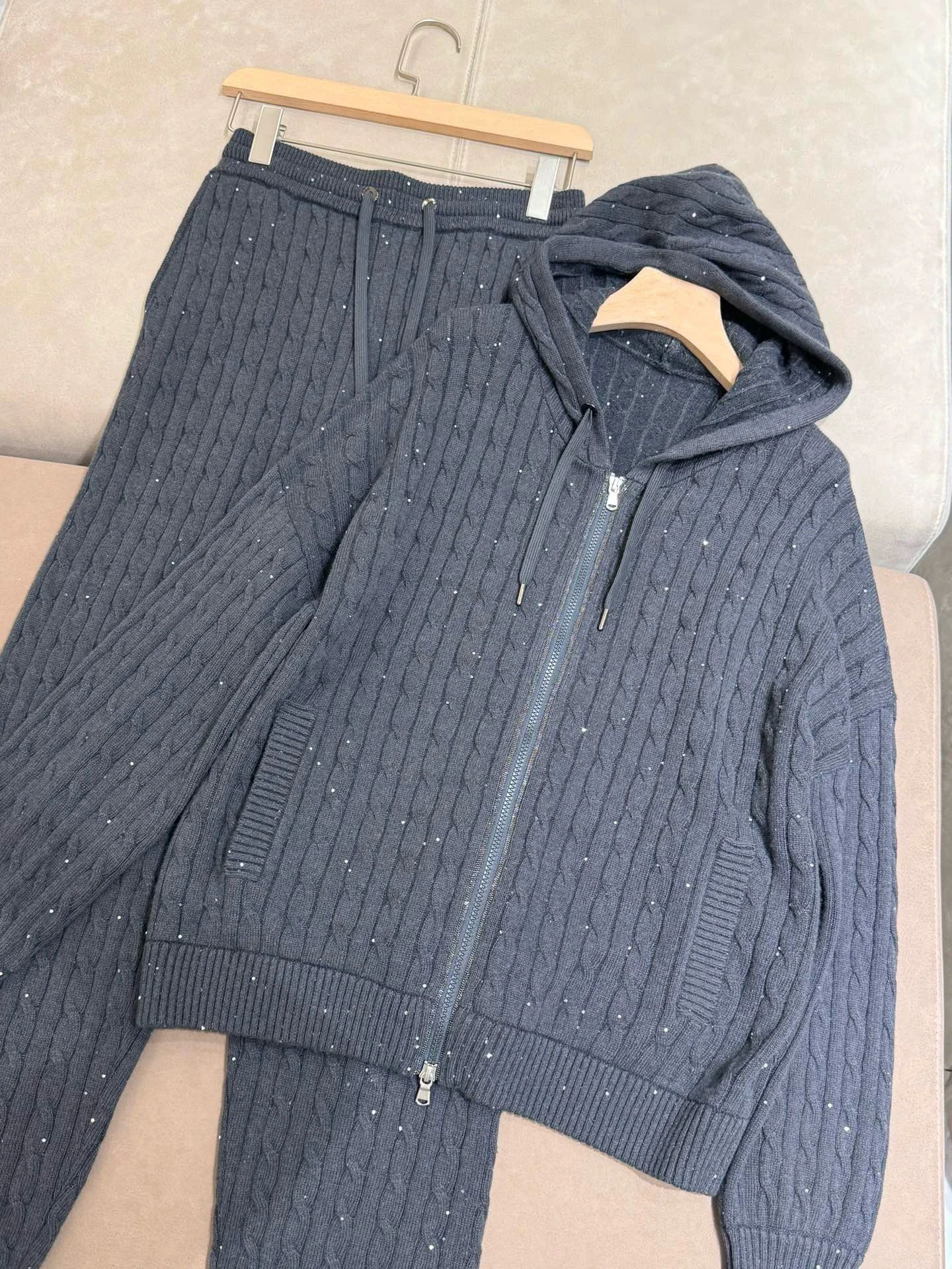 Wrap yourself in ultimate winter comfort with this luxurious autumn-winter hooded 100% wool knitted cardigan set. Designed with elegant beaded sequin details and a smooth front zipper, this two-piece outfit blends sophistication with cosy everyday wear. The straight-leg pants offer relaxed comfort while keeping your silhouette chic and streamlined. Perfect for both casual days out and refined indoor lounging, this set is a versatile wardrobe essential. Crafted with high-quality wool, it provides natural warmth ideal for cooler UK seasons.