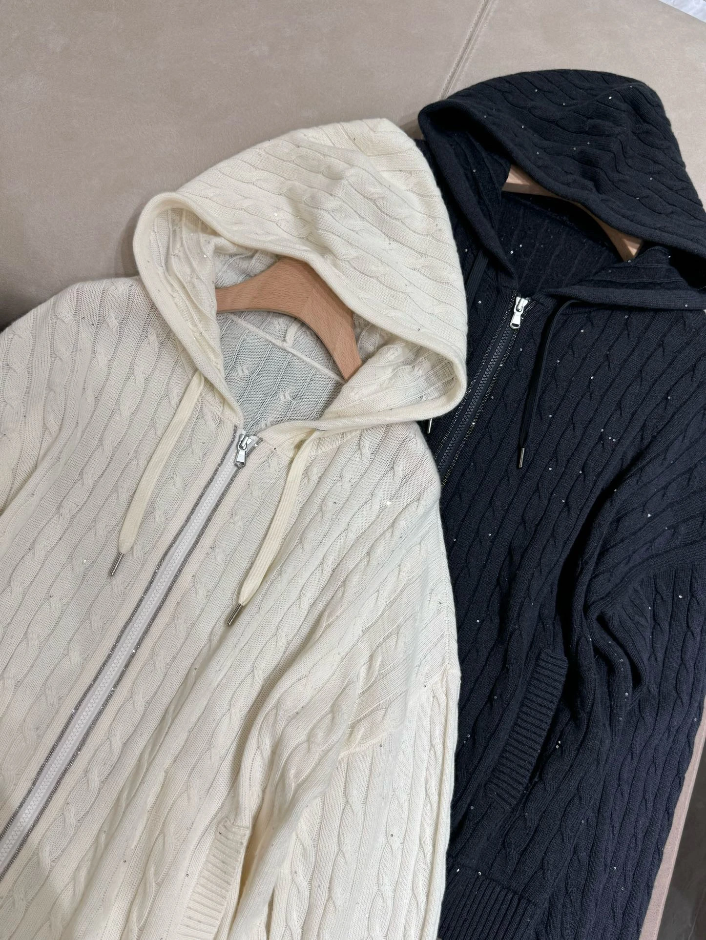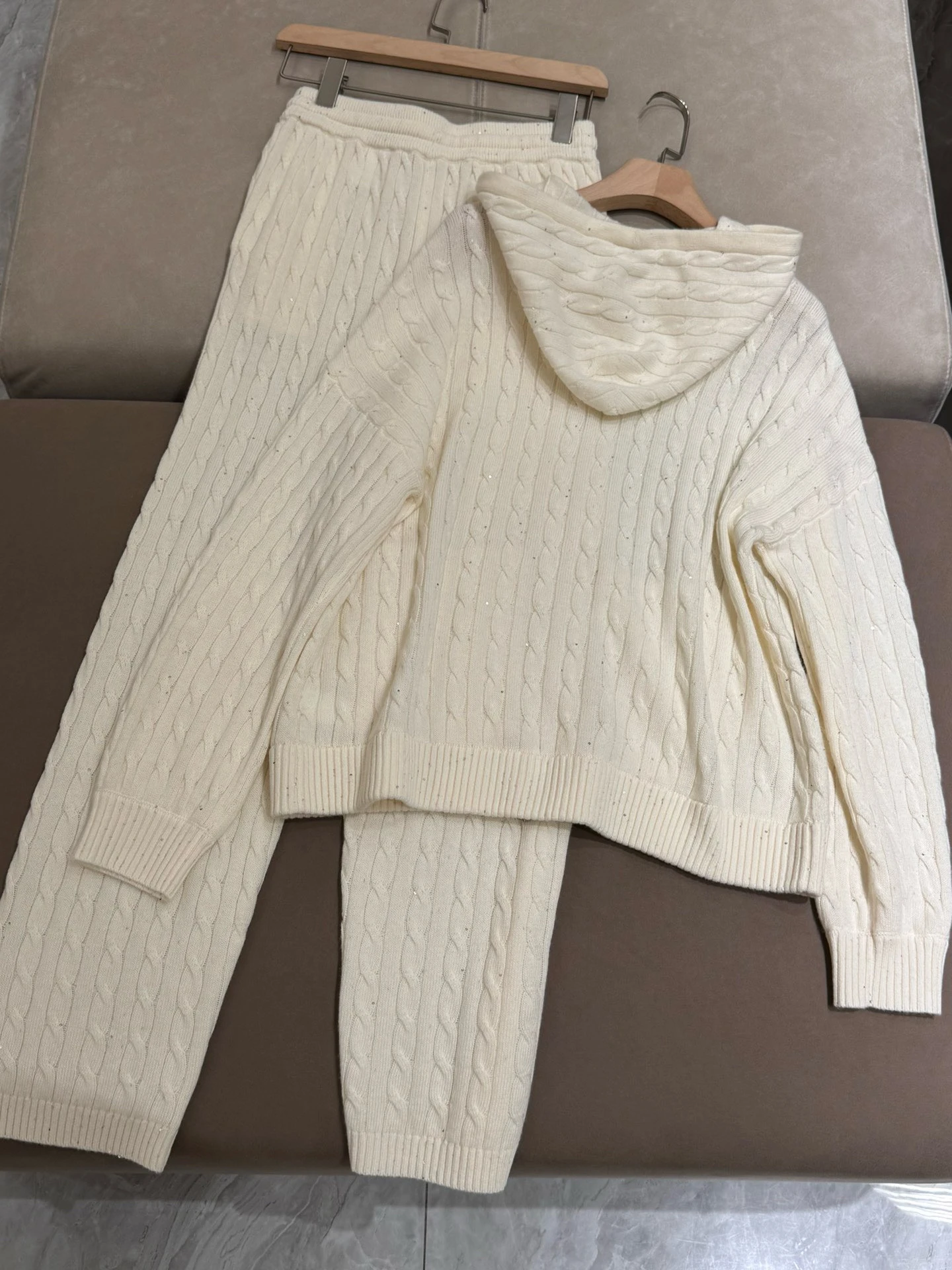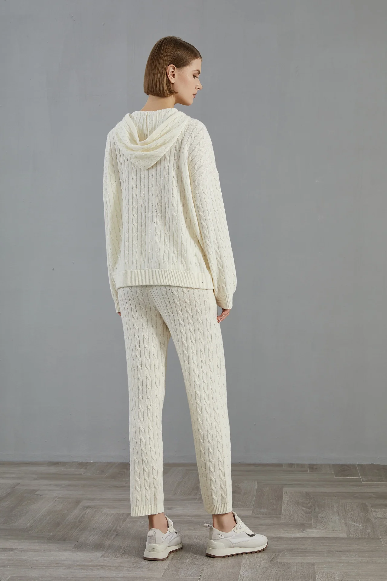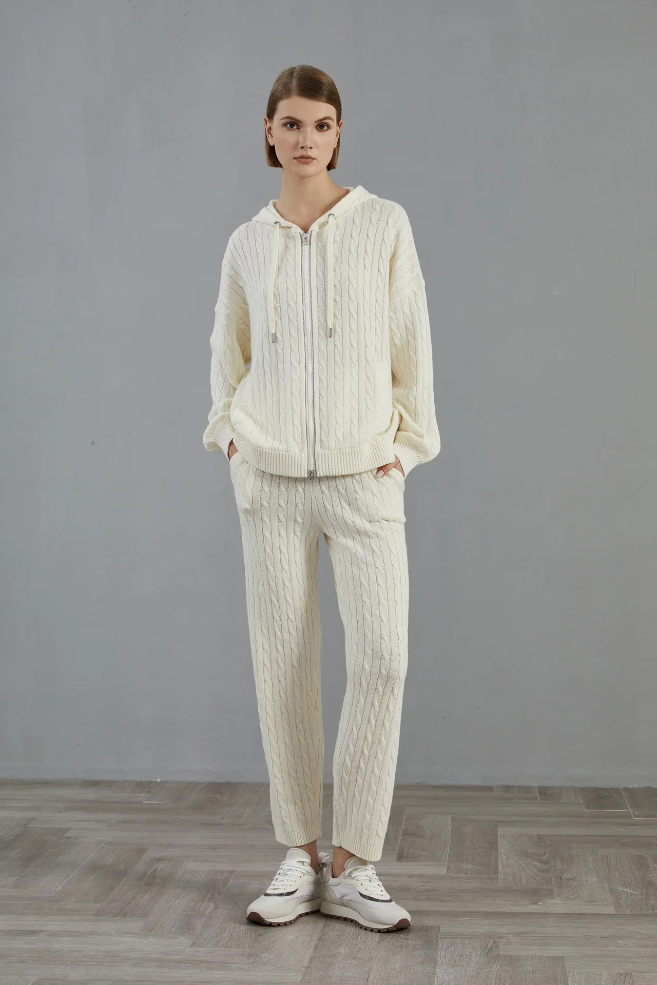 Wrap yourself in ultimate winter comfort with this luxurious autumn-winter hooded 100% wool knitted cardigan set. Designed with elegant beaded sequin details and a smooth front zipper, this two-piece outfit blends sophistication with cosy everyday wear. The straight-leg pants offer relaxed comfort while keeping your silhouette chic and streamlined. Perfect for both casual days out and refined indoor lounging, this set is a versatile wardrobe essential. Crafted with high-quality wool, it provides natural warmth ideal for cooler UK seasons.