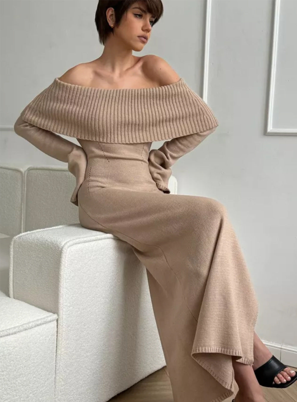 Elegant Off-Shoulder Knitted Dress — Flattering Fit & Versatile Style
