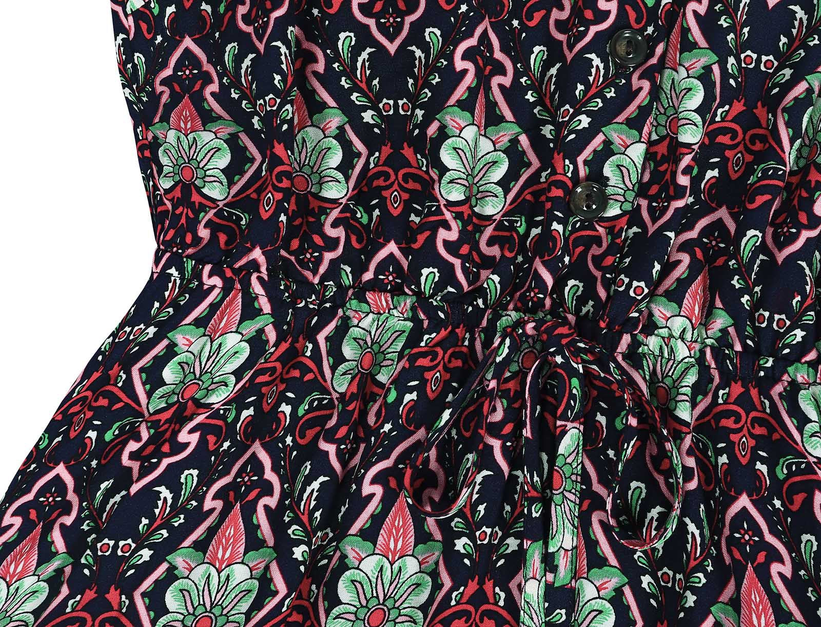 Design Features: Sleeveless halter neckline; V-neck front; elastic or tie at halter; pleated skirt; printed retro pattern