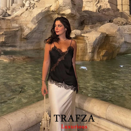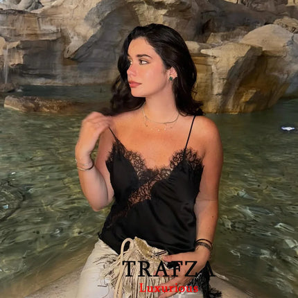 Black Lace Cami Top – Sexy V-Neck Y2K Sleeveless Patchwork Blouse