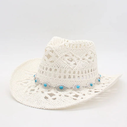 Our Bohemian Straw Cowboy Sun Hat brings vacation vibes with its hollow-out wide brim, wooden-bead and shell trim, and relaxed cowboy silhouette. Crafted from breathable woven straw, it’s perfect for beach days, music festivals, or desert strolls—blending protection with artisanal charm.