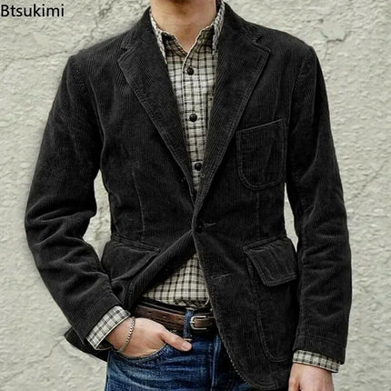 Add classic structure and textured style to your autumn wardrobe with this vintage corduroy jacket for men. Featuring subtle shoulder pads, a lapel collar, and long sleeves, this solid-colour jacket bridges streetwear edge with suit jacket sharpness. Its slim-casual cut works perfectly for cooler months—layer over a sweater or wear with a tee for versatile looks. Built for autumn and early winter, it’s both fashion-forward and functional.