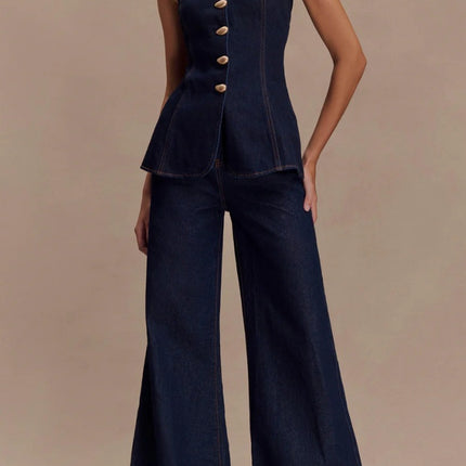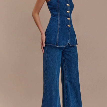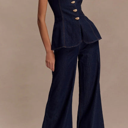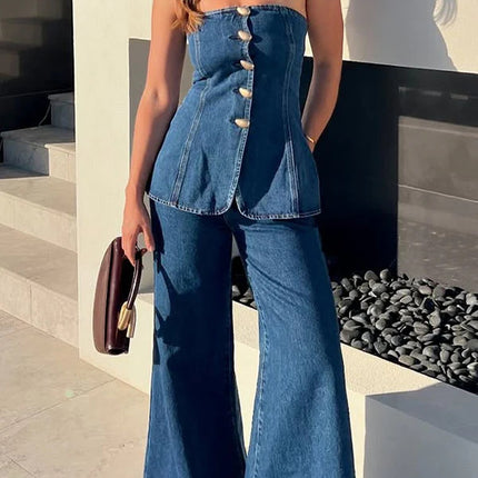 Denim Co-Ord Set: Off-Shoulder Button-Up Top & Straight Jeans