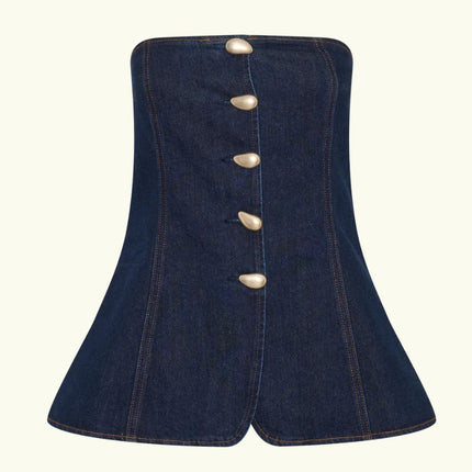 | Style Details | Off-shoulder top with buttons; top shaped like a cropped or waist length “skirt-top” style; jeans are straight leg; co-ordinated look |