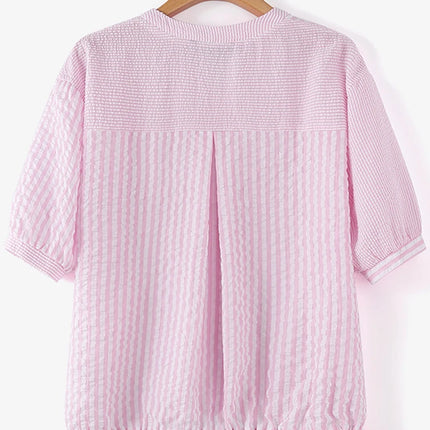 Featuring a relaxed oversized fit with bold vertical stripes, this half-sleeve blouse blends professional polish with breathable ease. The adjustable drawstring hem allows for custom shaping while the soft fabric keeps you cool through the warmer months. Ideal for office wear, casual outings, or weekend retreats.