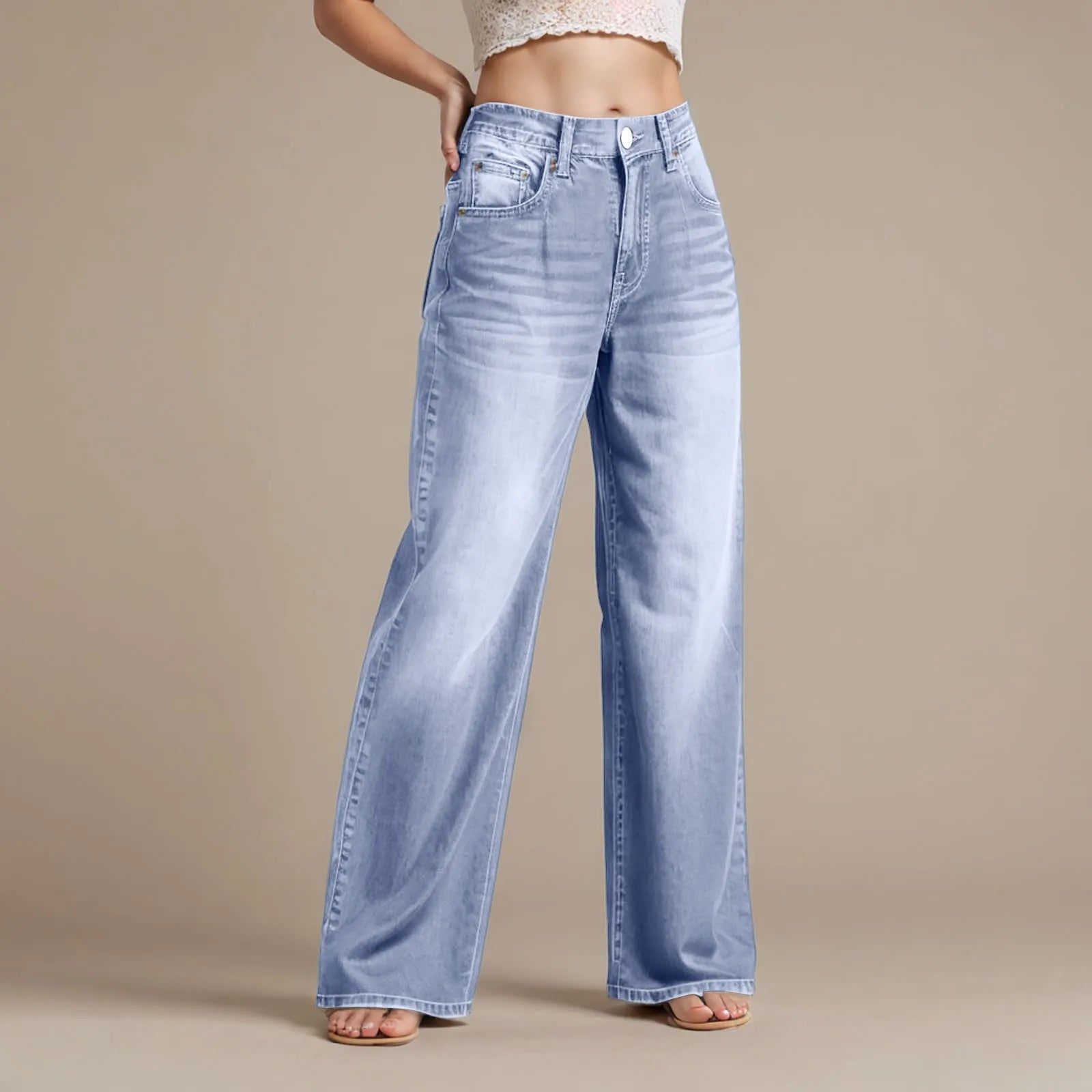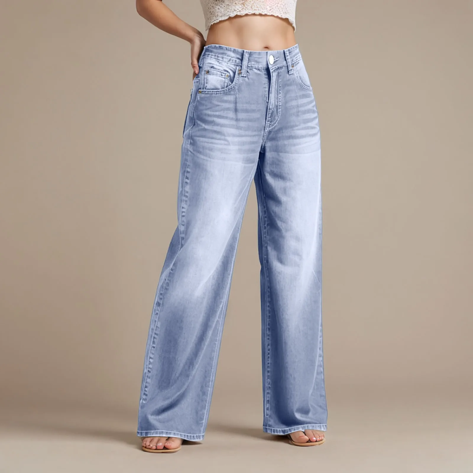High-Waist Blue Wash Wide-Leg Jeans for Women – Stretch Comfort, Baggy Style
