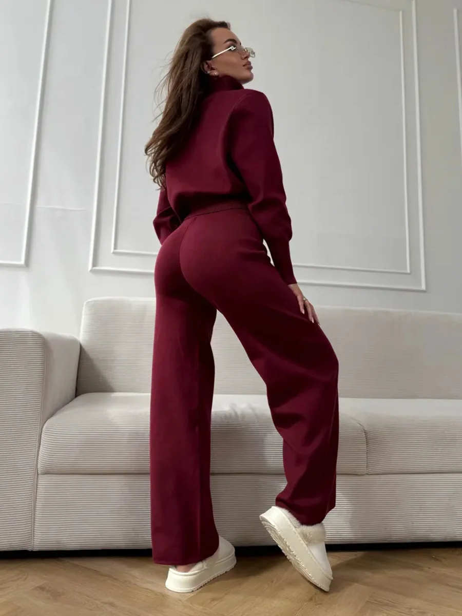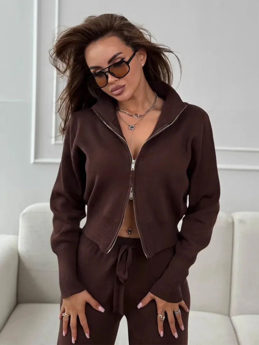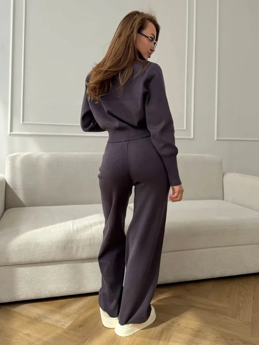 Effortless Knit Two-Piece: Zip-Up Cardigan & Wide-Leg Pants Set for All-Day Comfort