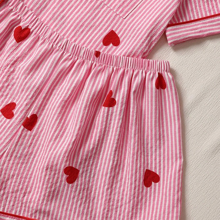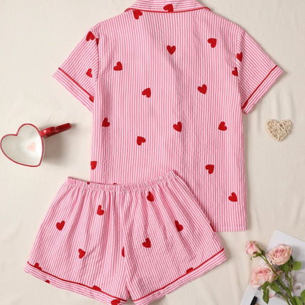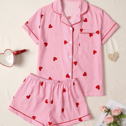 Our Pink Heart Print Pajama Set combines charming prints with elevated comfort. Featuring a breezy short-sleeve lapel top and relaxed elastic-waist shorts, it’s crafted from soft, lightweight material perfect for warm nights at home. The playful heart pattern brings a joyful, cozy touch ideal for lounging, sleep, or casual homewear.