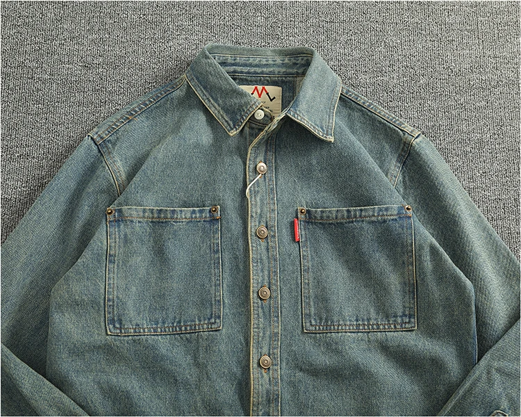 Retro Heavyweight Denim Cargo Shirt Men Cotton Washed Overshirt Jacket