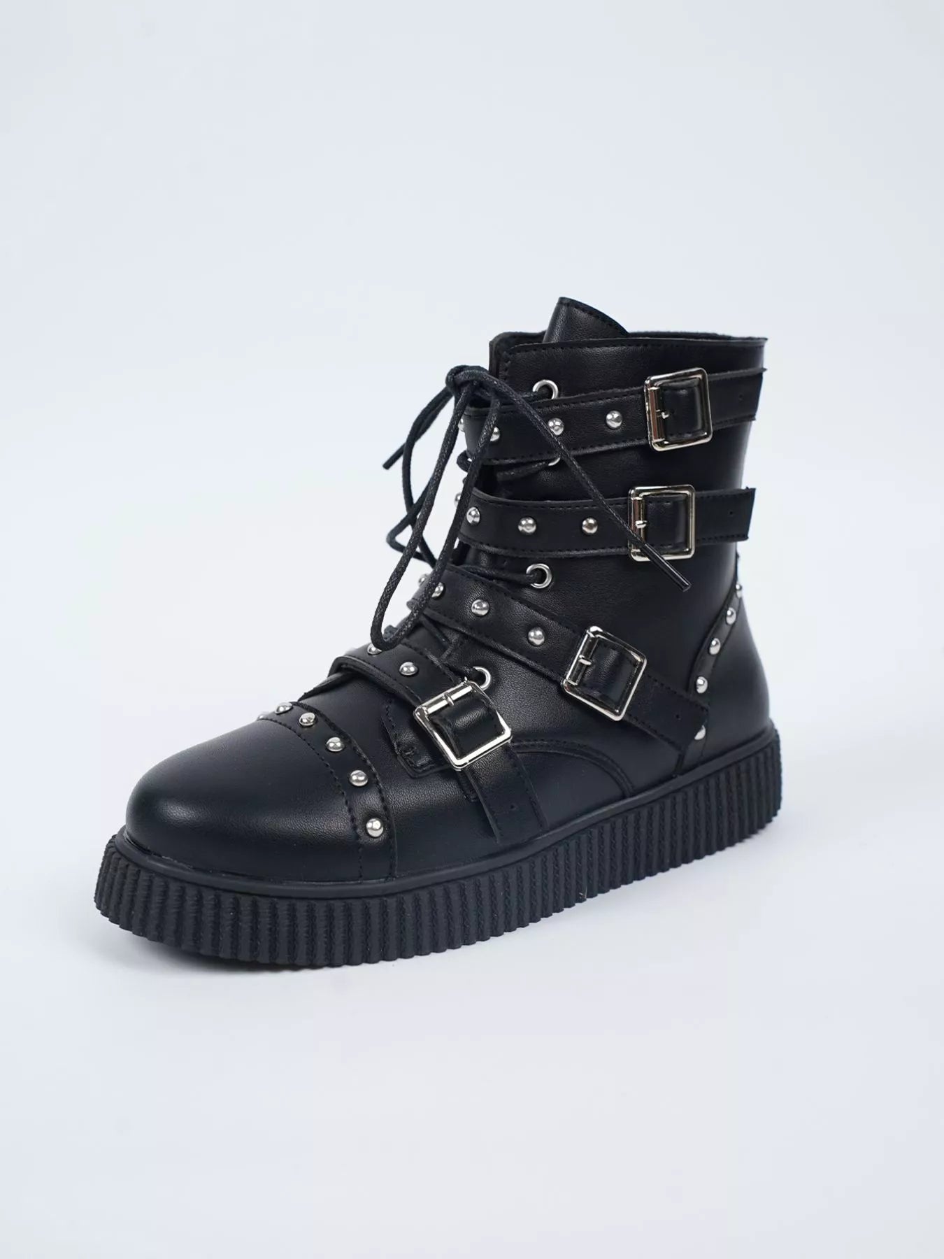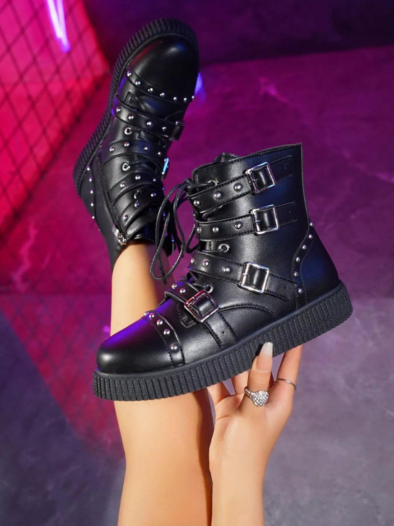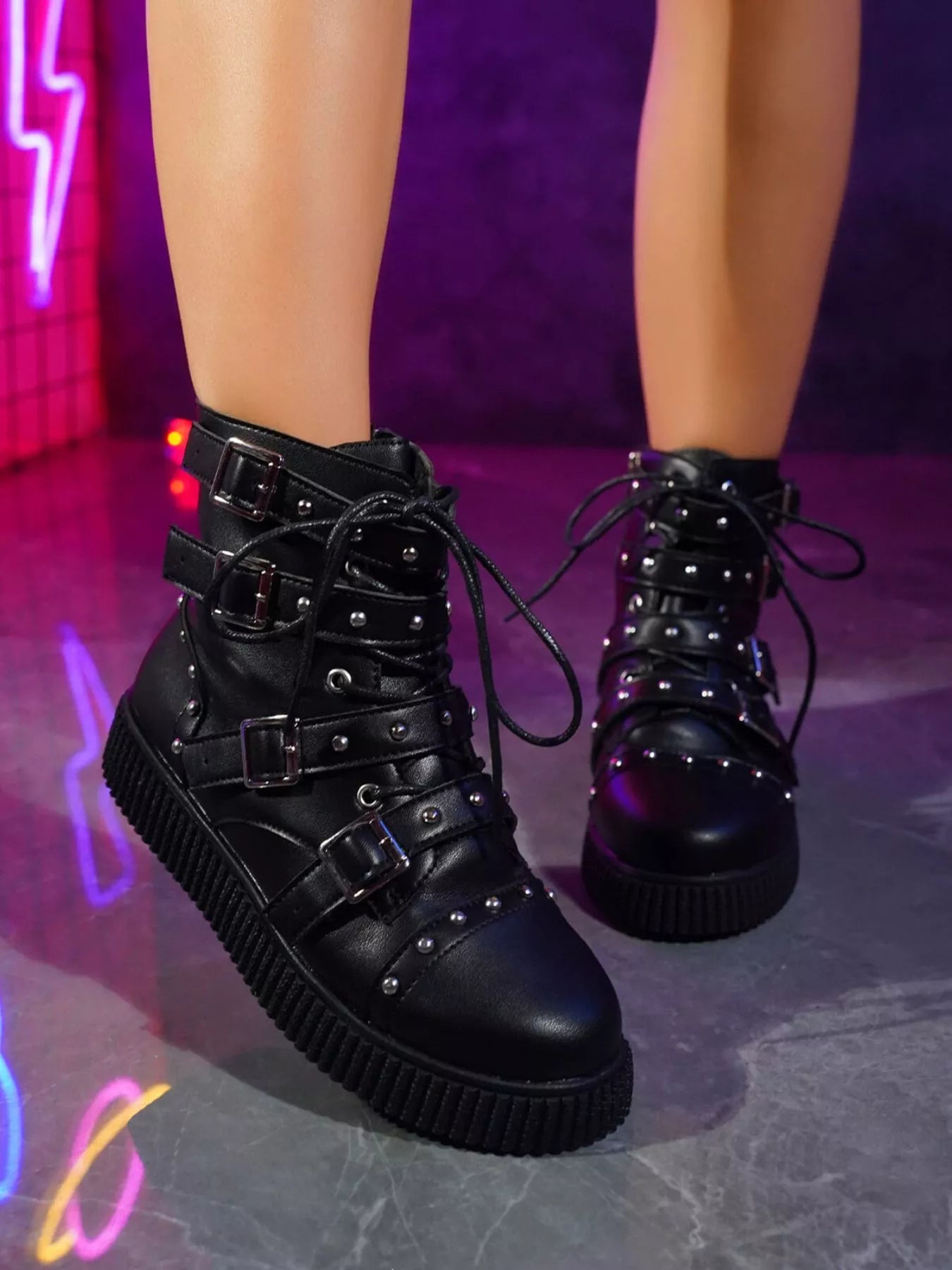 Style: Ankle-height boots with a round toe and chunky platform sole