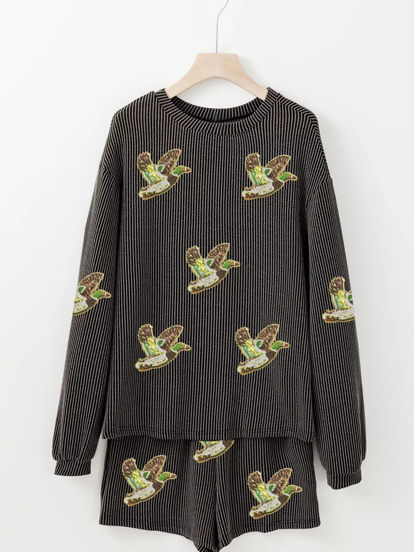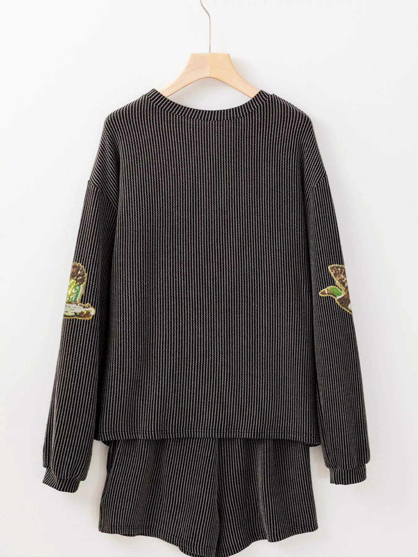 Sequin Patched Ribbed Long Sleeve Top & Shorts Set