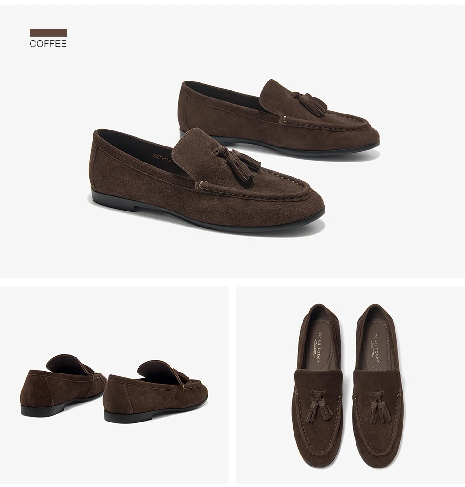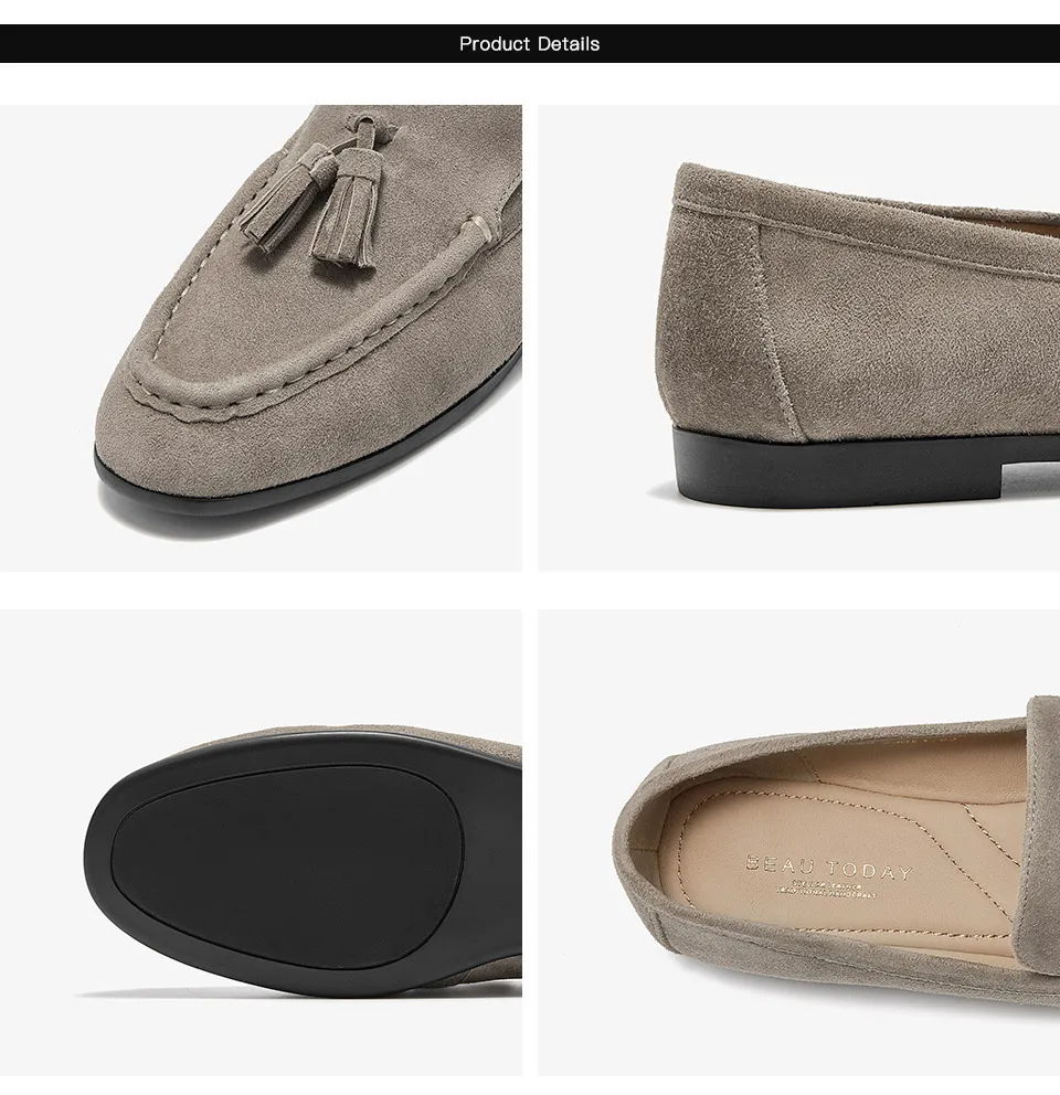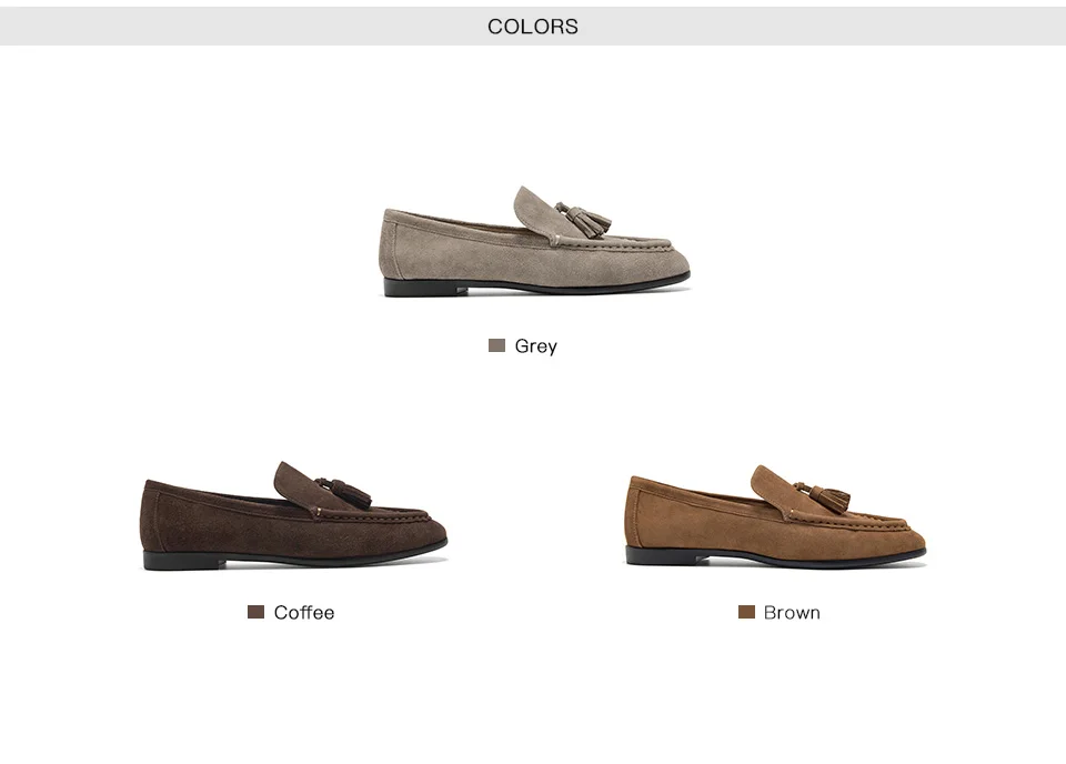 Step into effortless style and comfort with our suede tassel loafers. These slip-on flats combine a refined, minimalist aesthetic with soft materials and elegant tassel detail. Perfect for office days, casual weekends or travel, they deliver a polished look without compromising on ease. Experience the blend of luxury texture and everyday wearability in one shoe.
