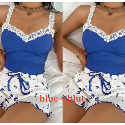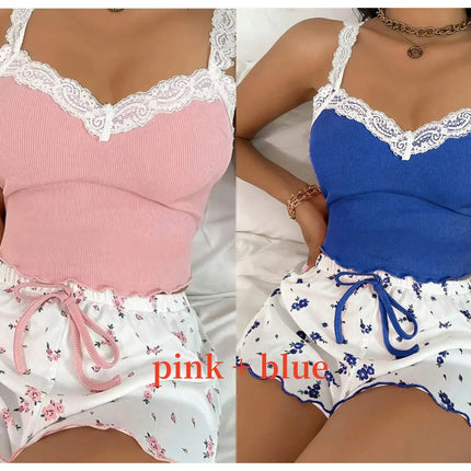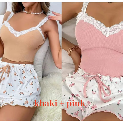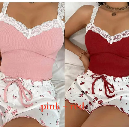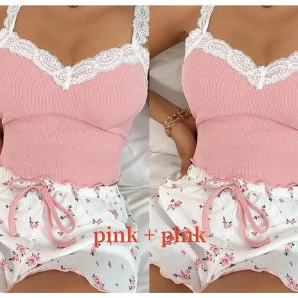 Women’s Pink Lace Patchwork Camisole & Shorts Pajama Set – Sexy Lounge Sleepwear