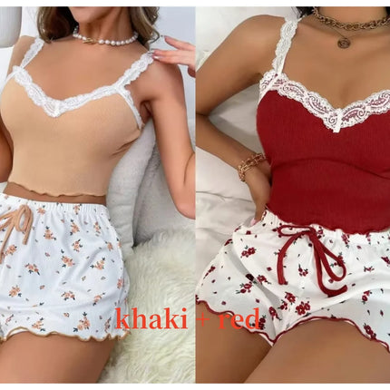Indulge in luxurious comfort with our Women’s Pink Lace Patchwork Pajama Set. This alluring two-piece sleepwear combines a V-neck cami with delicate lace trim and matching printed shorts. Crafted from soft, breathable fabric, it offers a relaxed fit perfect for lounging, sleepovers, or weekend relaxation. Feminine, flirty, and effortlessly chic, this set brings romance to your nighttime routine.