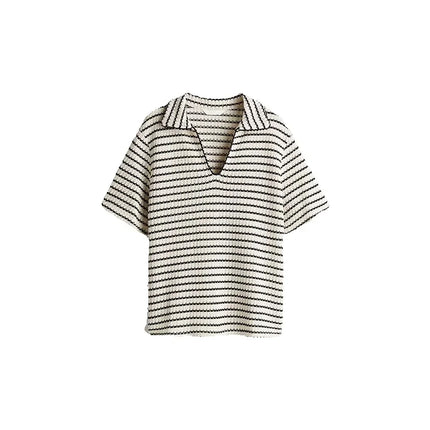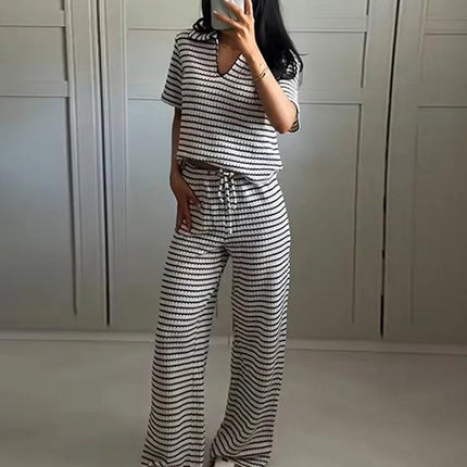 Elevate your everyday look with this Casual Women's Knit Striped Pullover & Pants Set. Featuring a relaxed-fit short-sleeve polo top and matching wide-leg drawstring pants, this two-piece outfit delivers breathable comfort and chic coordination. The subtle striped knit pattern adds a touch of visual interest, perfect for lounging, casual outings, or travel days.