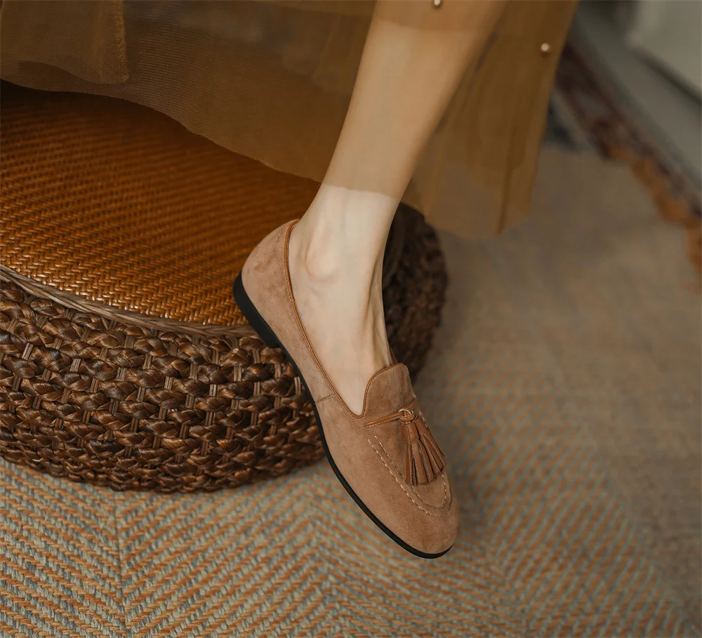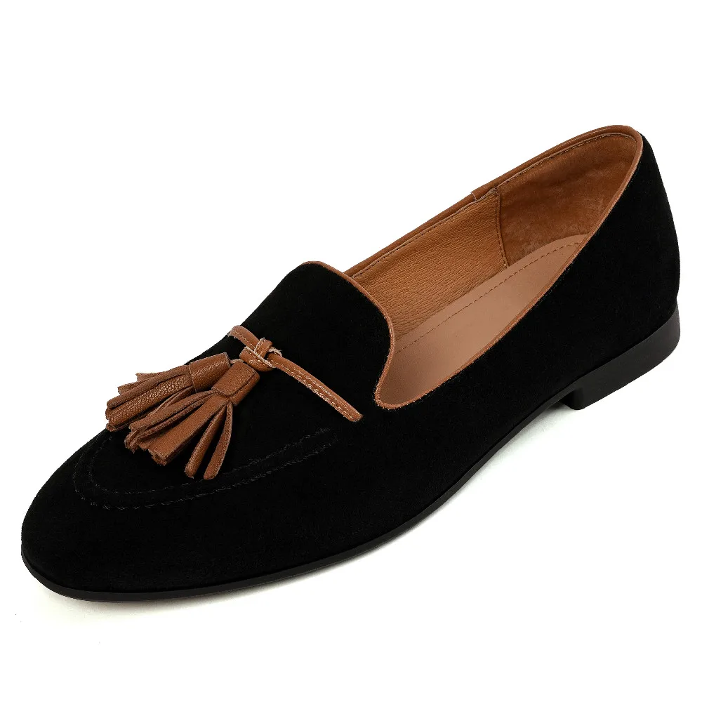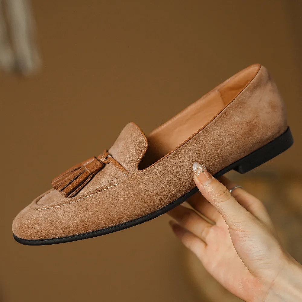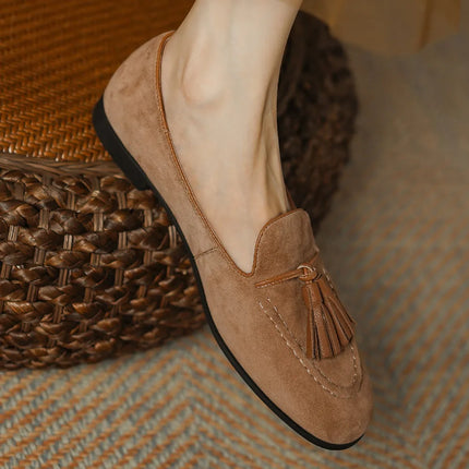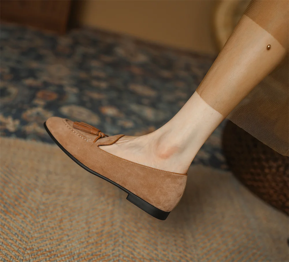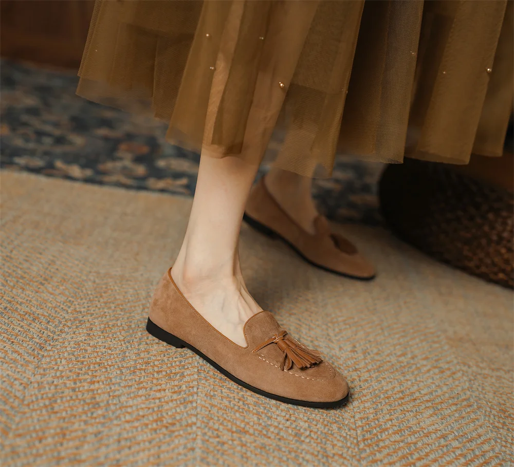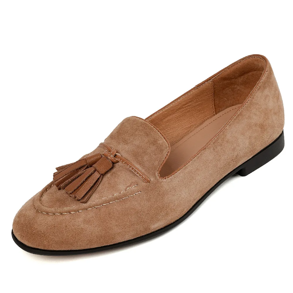 Step into comfort and casual elegance with our women’s suede fringe moccasin ballet flats. Crafted from natural suede, these slip-on ballerines combine relaxed style with subtle detailing. The fringed vamp adds boho flair, and the round toe shape ensures a timeless silhouette. Perfect for city strolls, casual workdays, or weekend wear, these flats bring understated sophistication to your wardrobe.