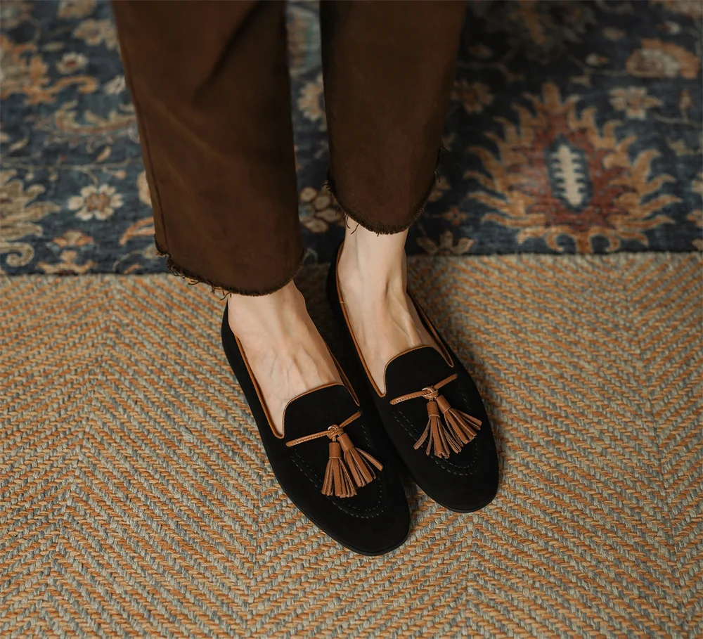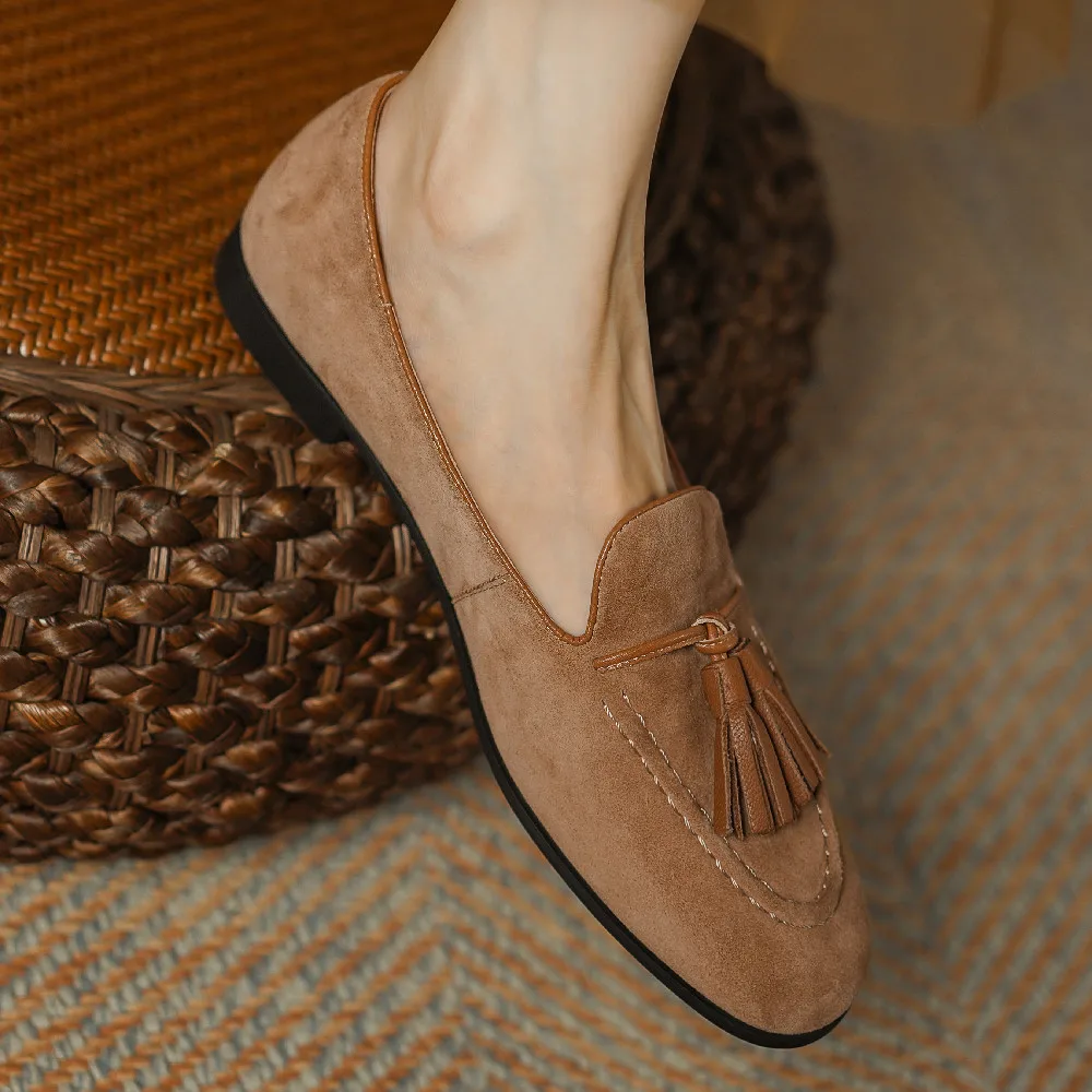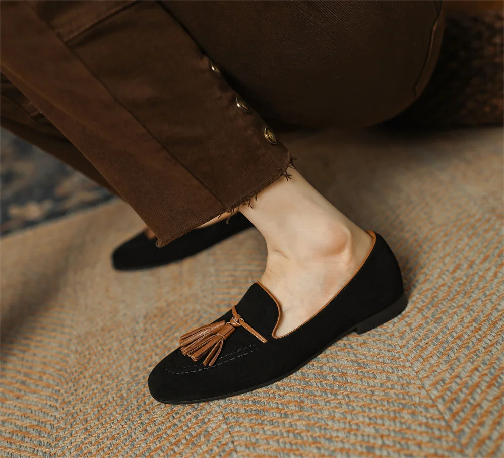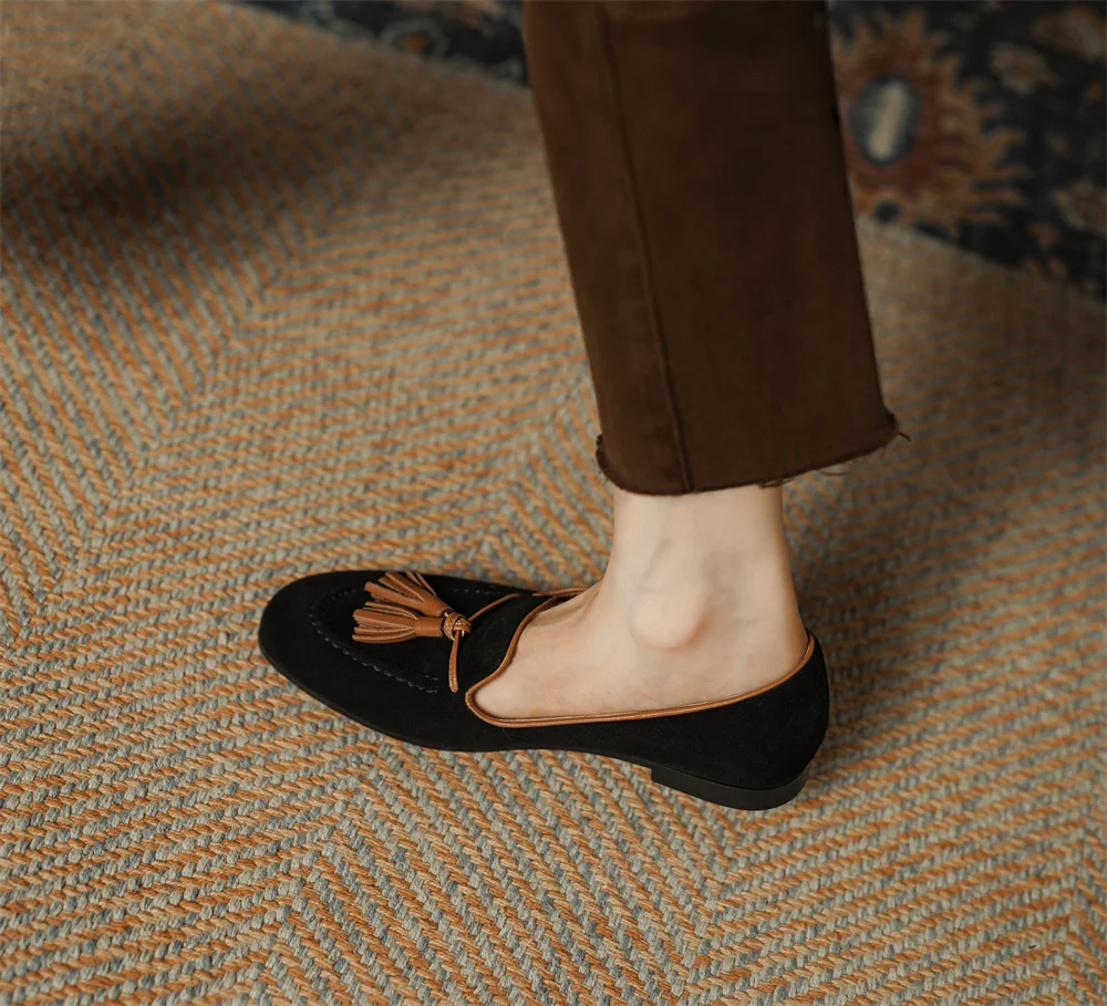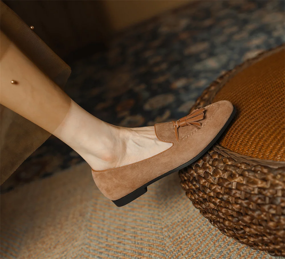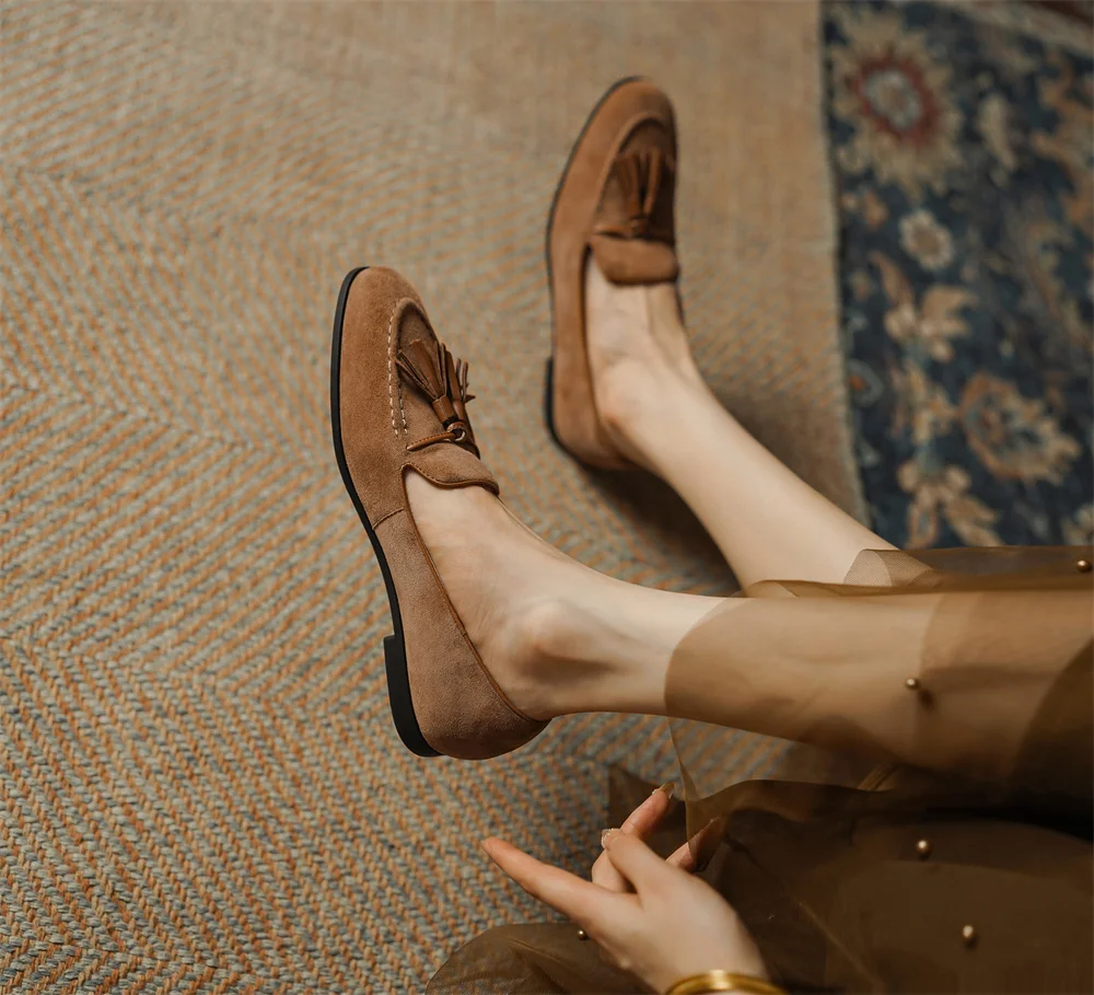 Step into comfort and casual elegance with our women’s suede fringe moccasin ballet flats. Crafted from natural suede, these slip-on ballerines combine relaxed style with subtle detailing. The fringed vamp adds boho flair, and the round toe shape ensures a timeless silhouette. Perfect for city strolls, casual workdays, or weekend wear, these flats bring understated sophistication to your wardrobe.