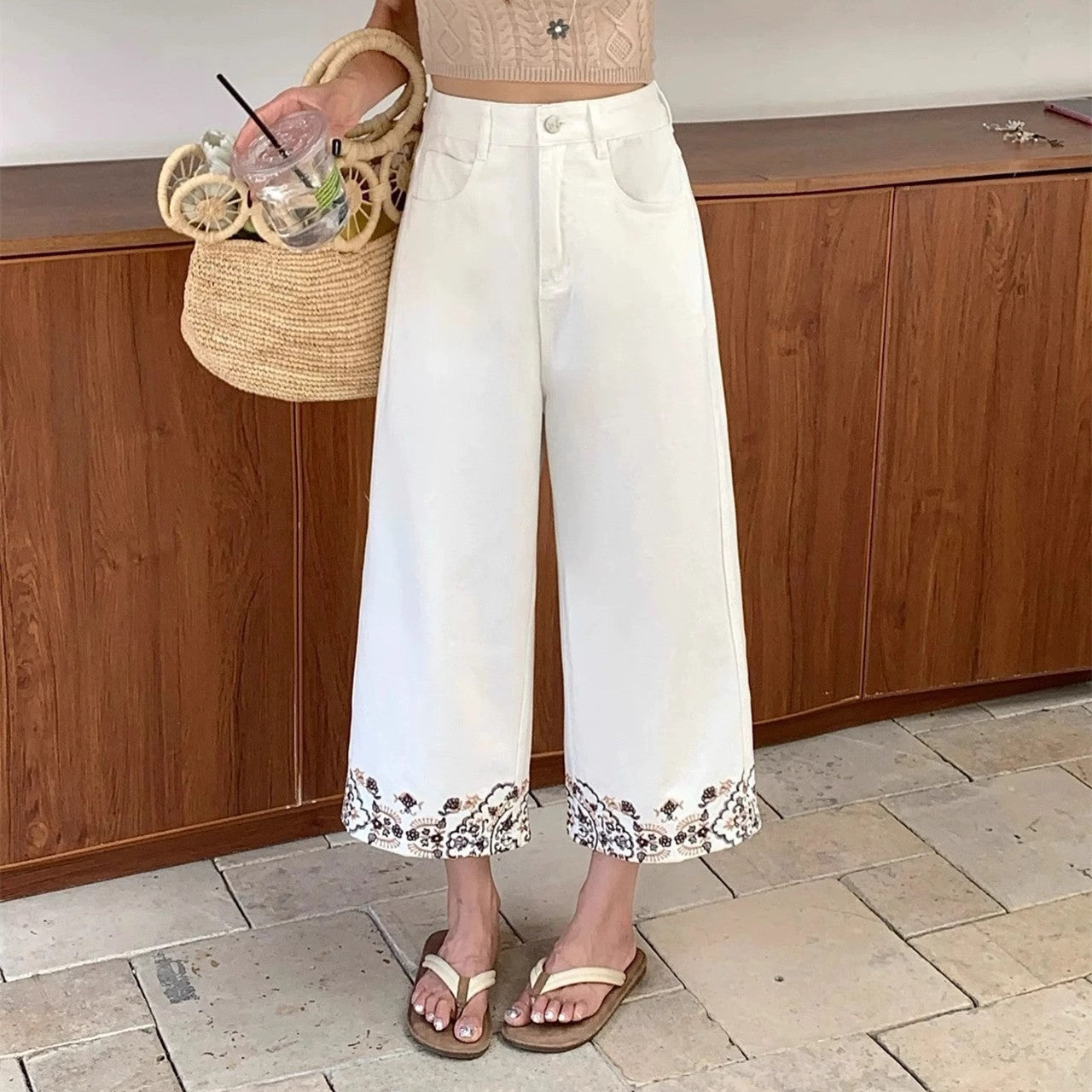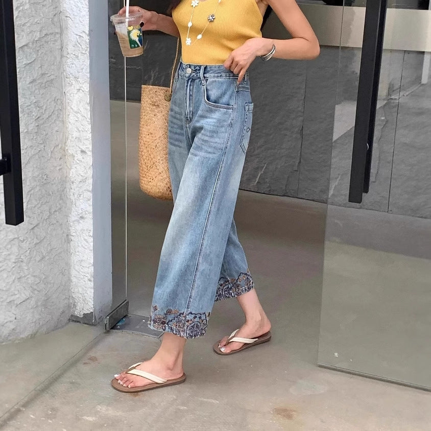 Discover your new summer favourite with these 8-inch wide-leg jeans, made in Europe and designed for a breezy, effortless look. Featuring delicate embroidery and a lightweight construction, they offer both style and comfort without the bulk. Cut in a flattering wide leg that flows softly from the hip, these jeans are ideal for warm days, casual meetups or anywhere you want to stay cool while looking chic. Available in versatile blue and white washes to match your full summer wardrobe.